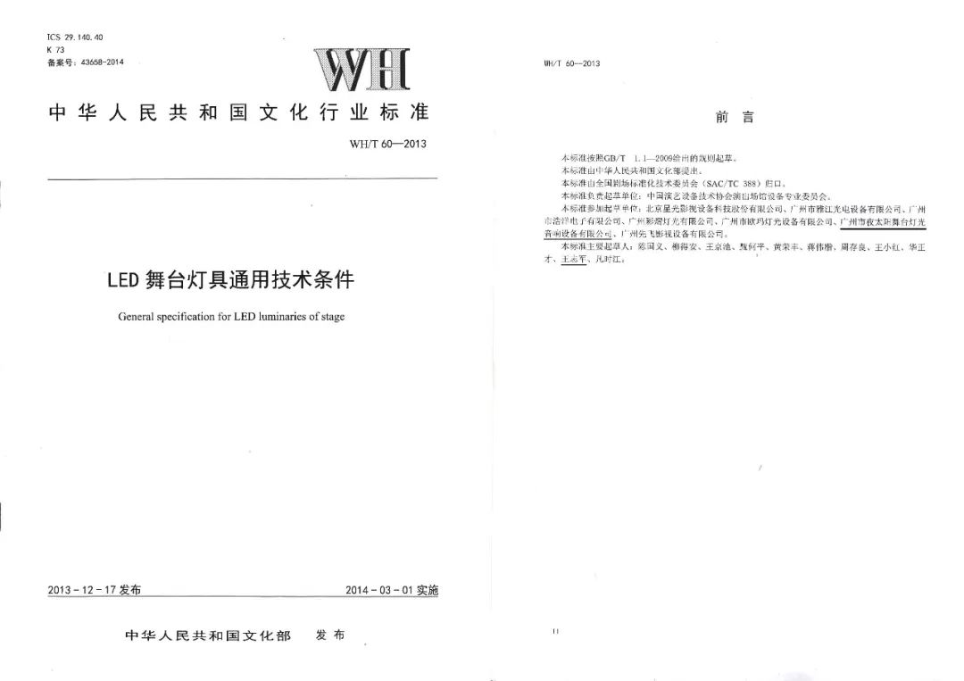 2013年受邀參與,國家文化部在舞臺燈光行業(yè)制訂的行業(yè)國家級標準《LED舞臺燈具通用技術條件》及《演出場所電腦燈具性能參數(shù)測試方法》起草制訂。