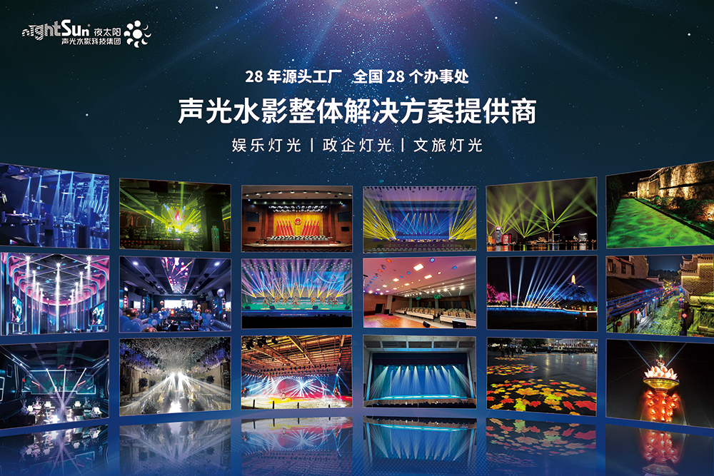 廣東夜太陽科技集團(tuán)有限公司,始創(chuàng)于1995年,以聲、光、水、影四大領(lǐng)域為主營業(yè)務(wù)。下轄十幾個子屬公司,自購自建70000平方米工業(yè)園,中國十大燈光品牌,國家高新技術(shù)企業(yè),100余項國家專利,10余篇國家級論文,“Nightsun夜太陽”50多個國家注冊商標(biāo),國家標(biāo)準(zhǔn)、地方標(biāo)準(zhǔn)的制訂參與者,微舞臺、微文旅、娛移動概念全球創(chuàng)始人。集團(tuán)生產(chǎn)強(qiáng)調(diào)原創(chuàng)研發(fā)和精益制造;集團(tuán)營銷為國外近80個國家和地區(qū)的客戶提供一站式采購配套;國內(nèi)設(shè)立28個技術(shù)服務(wù)部,近距離為客戶提供“協(xié)同銷售、整體解決”服務(wù)。
