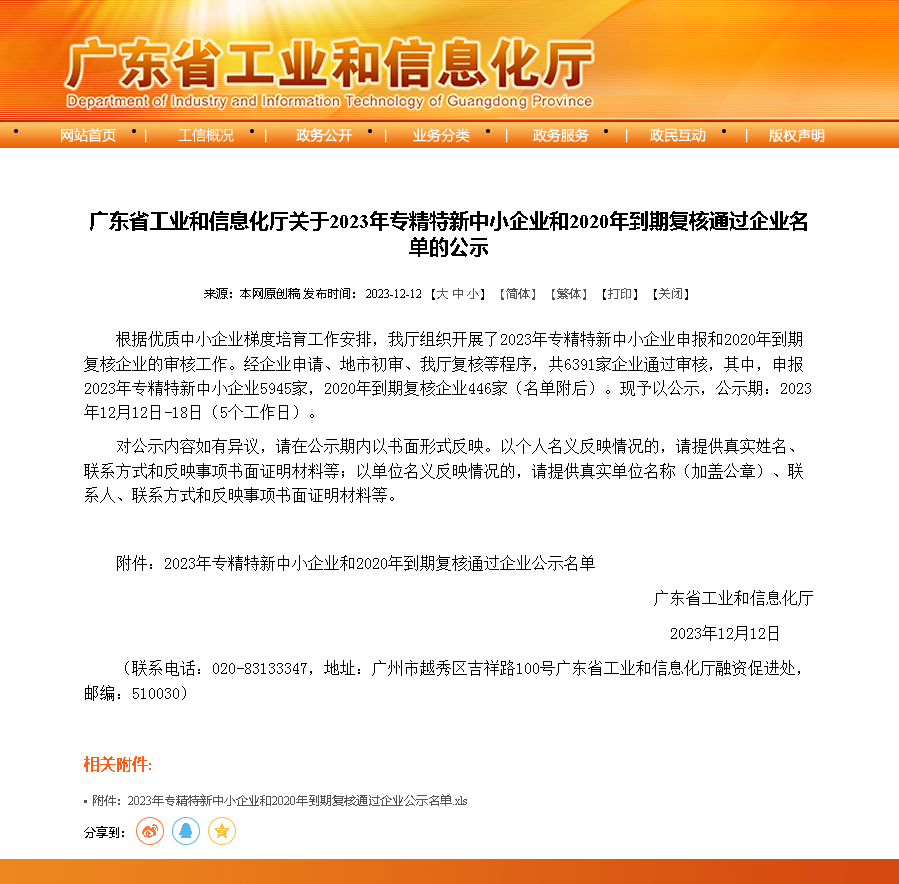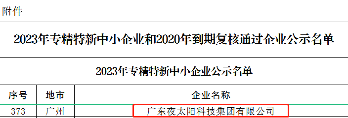 近日,廣東省工業(yè)和信息化廳公布了廣東省工業(yè)和信息化廳關(guān)于2023年專精特新中小企業(yè)和2020年到期復(fù)核通過企業(yè)名單的公示,經(jīng)企業(yè)自主申報(bào)、嚴(yán)格審查、專家評選、審核復(fù)核,以及網(wǎng)上公示等程序,共6391家企業(yè)通過審核。其中廣東夜太陽科技集團(tuán)有限公司(以下簡稱“夜太陽”)憑借專業(yè)研發(fā)和創(chuàng)新能力等優(yōu)勢,入選為“2023年廣東省專精特新中小企業(yè)”。