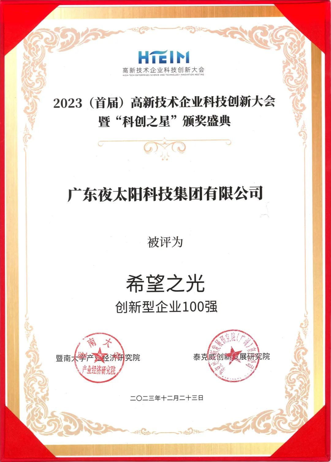 其中廣東夜太陽(yáng)科技集團(tuán)有限公司(以下簡(jiǎn)稱“夜太陽(yáng)”)憑借專業(yè)研發(fā)和創(chuàng)新能力等優(yōu)勢(shì),入選為2023年科創(chuàng)之星"希望之光"創(chuàng)新型企業(yè)100強(qiáng)。
