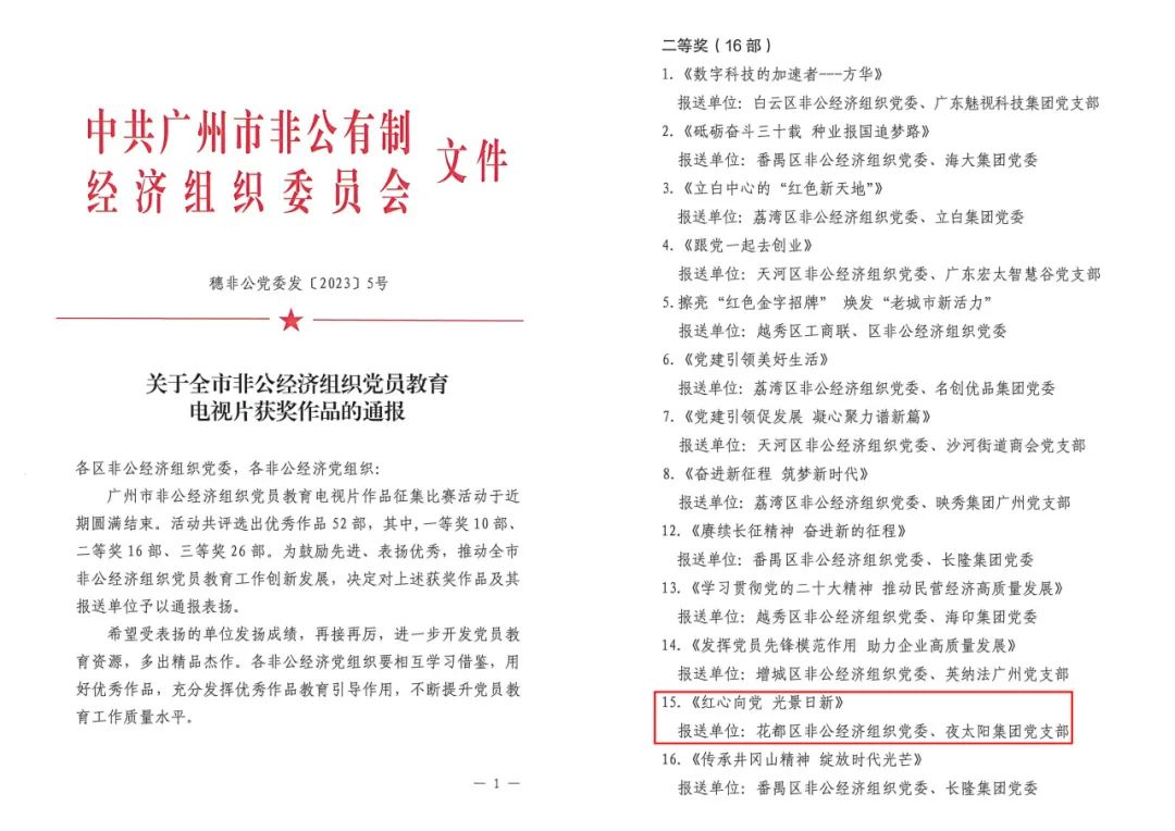 2023年7月,廣州市非公有制經(jīng)濟組織委員會向全市非公經(jīng)濟組織黨委、重點聯(lián)系非公企業(yè)黨組織征集黨員教育電視片征集比賽活動,由品牌推廣中心策劃、執(zhí)行,王志洪董事長主演,全體伙伴的配合下,集團出品的5分鐘專題片《紅心向黨、光景日新》,獲得廣州市征集比賽二等獎,也是花都地區(qū)唯一獲獎的燈光企業(yè)。