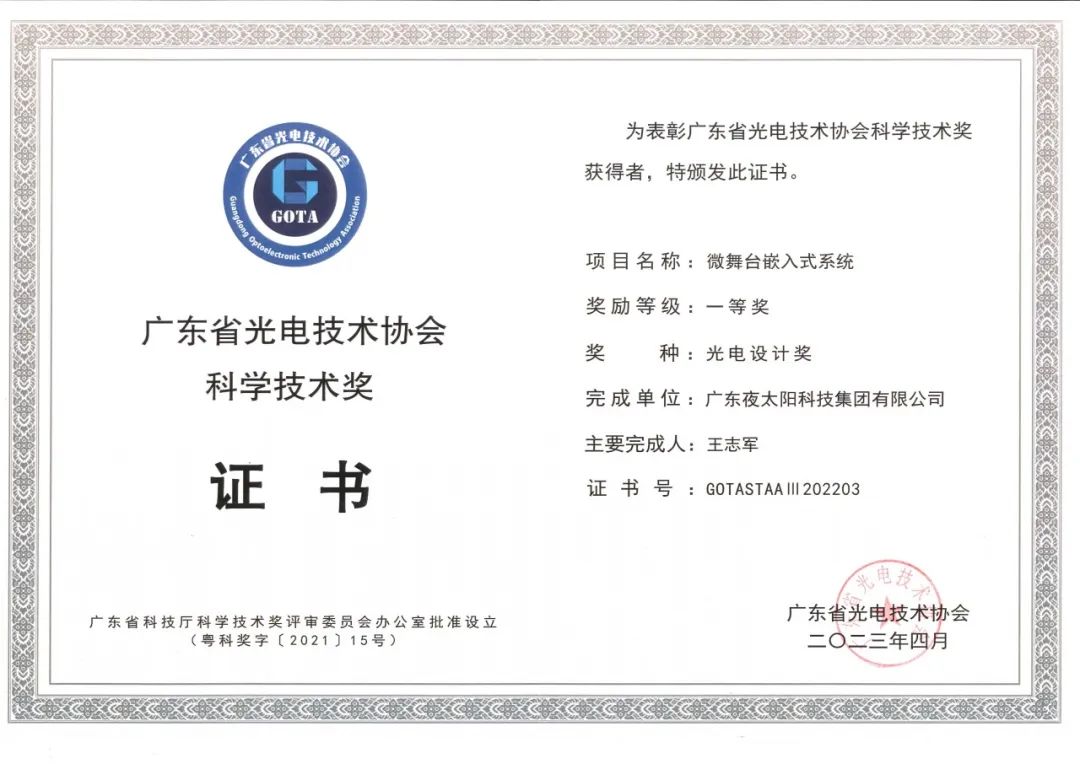 3月,夜太陽首創(chuàng)微舞臺技術系統(tǒng)榮獲《廣東省光電協(xié)會科學技術獎丶光電技術一等獎》,并在科技廳備案。