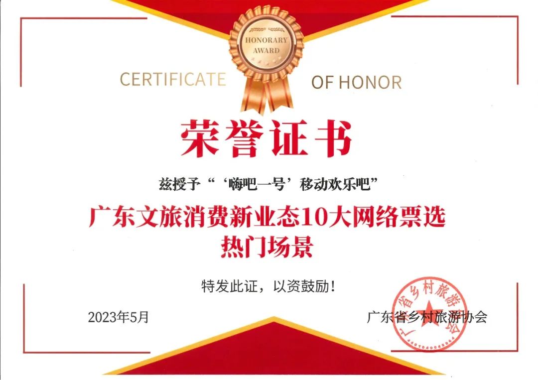 2023春節(jié)期間,由廣東省文化旅游廳主辦、廣東省鄉(xiāng)村旅游協(xié)會承辦的“廣東文旅消費新業(yè)態(tài)熱門場景評選活動”正式啟動;推出了9期票選活動,吸引了近百萬人次的瀏覽和參與投票。2023年5月中旬,經(jīng)初審、網(wǎng)絡票選和專家評審等環(huán)節(jié),夜太陽原創(chuàng)“移動娛樂車——嗨吧一號”榮登“廣東文旅消費新業(yè)態(tài)人們場景10大網(wǎng)絡票選熱門榜”!
