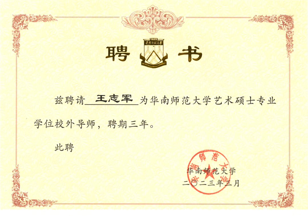 5月,王志軍總經(jīng)理受聘為華南師范大學藝術碩士專業(yè)學位校外導師,聘期三年。