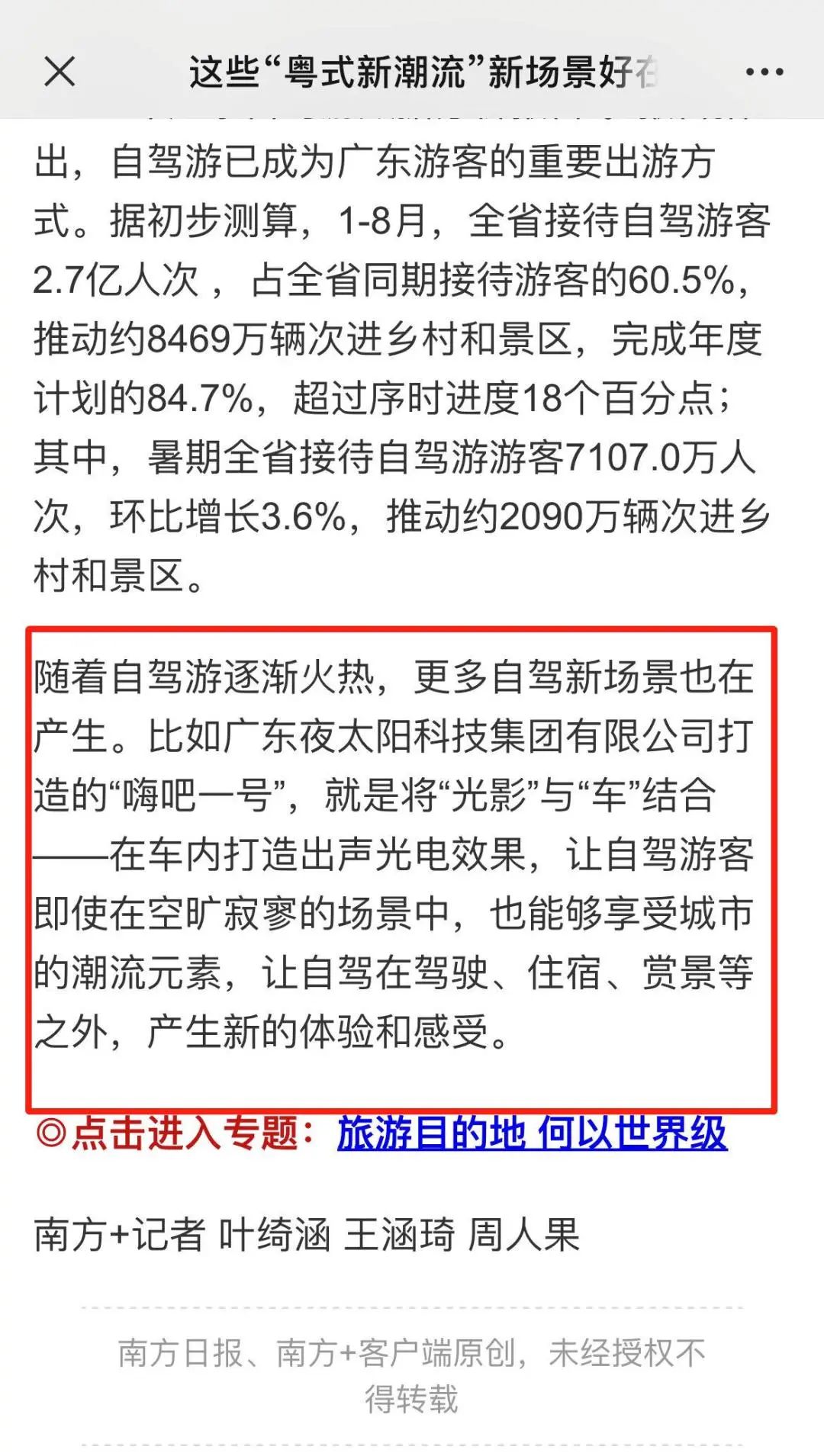 重量級(jí)黨媒南方+、廣東衛(wèi)視新聞聯(lián)播、觸電新聞等以及廣東省文化旅游廳微信公眾號(hào)“廣東文旅”、廣東省鄉(xiāng)村旅游協(xié)會(huì)微信公眾號(hào)均報(bào)道了“廣東文旅消費(fèi)新業(yè)態(tài)主題展區(qū)”和“粵式新潮流”文旅新業(yè)態(tài)、新場(chǎng)景推介交流會(huì),其中“南方+”在新聞末尾點(diǎn)評(píng)了“嗨巴一號(hào)”:光影與車(chē)的結(jié)合,讓游客即使在空曠寂寥的場(chǎng)景中,也能享受城市的潮流元素。
